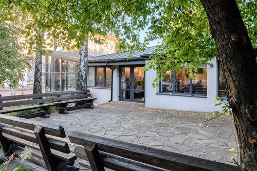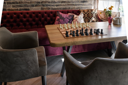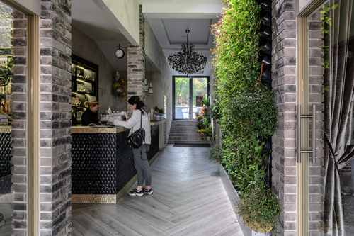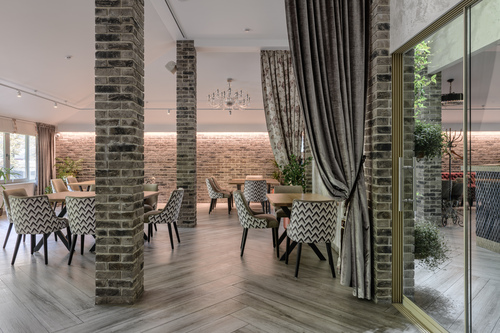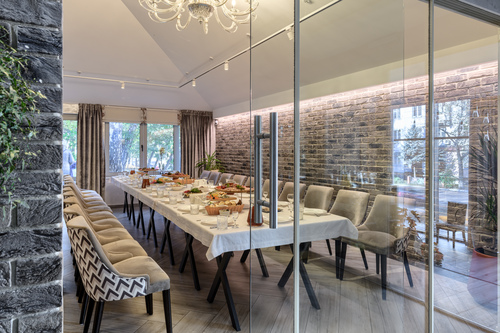 Інтер'єр ресторану поєднує класику та елегантність: великі вікна, пастельні тони, дзеркала, жакардові штори, плавні лінії та плюшева текстура крісел та диванів, затишні подушки та м'яке освітлення. Розслаблена атмосфера, сприяє комфортному спілкуванню, де кожен гість оточений увагою і турботою нашого персоналу.